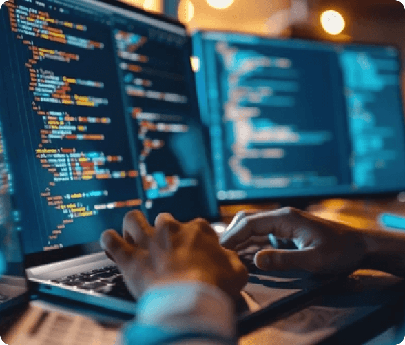 An individual working on a laptop, with a screen filled with code, illustrating a programming task in progress.